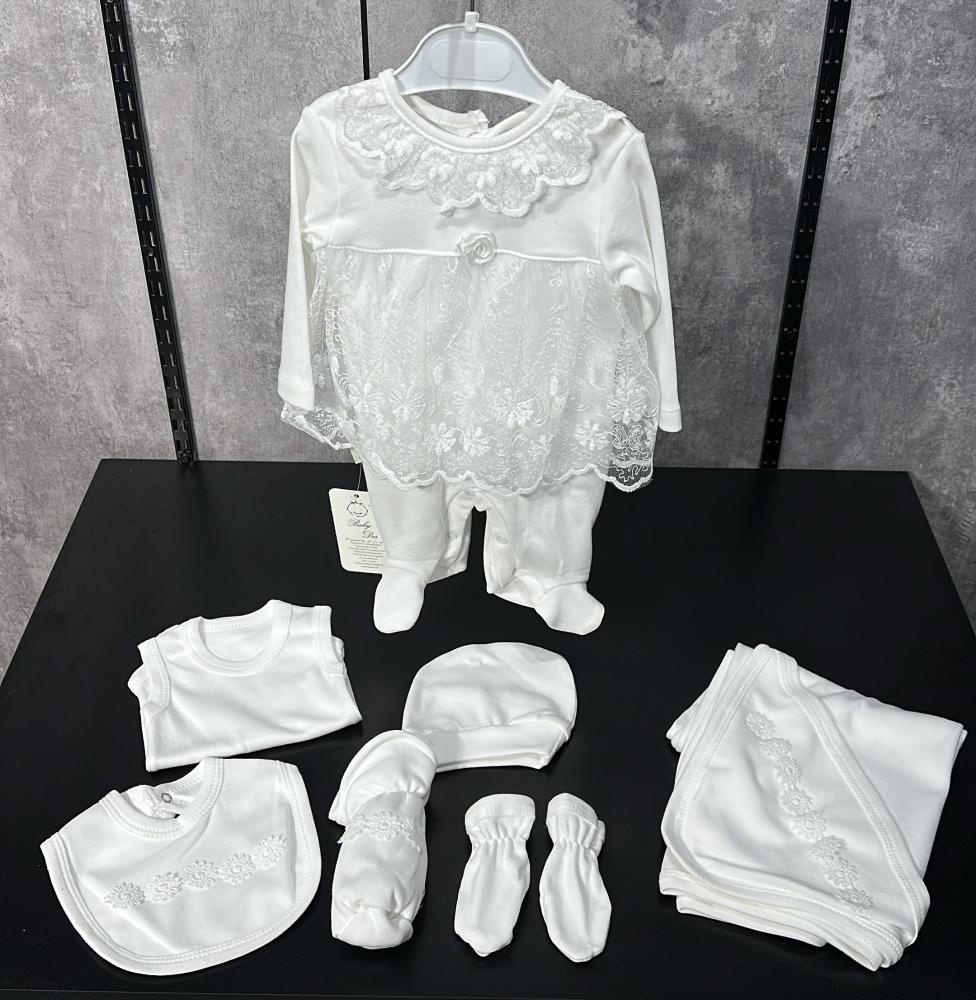 استقبلي مولودتك بأجمل طقم متكامل من جنى أوبي، مصنوع من أجود أنواع القطن الناعم ليكون لطيفًا على بشرة الطفل الحساسة. يتميز الطقم بفستان أنيق مزين بتفاصيل دانتيل فاخرة تضيف لمسة من الرقي والفخامة، ومصنوع بعناية في تركيا لضمان الجودة العالية.