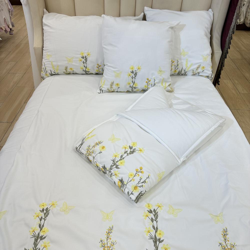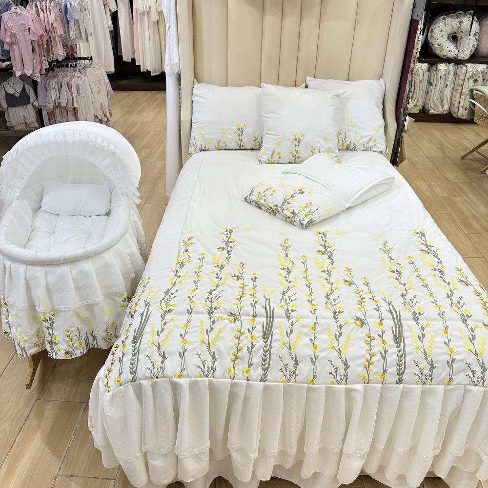 طقم استقبال فاخر بتطريز ليموني أنيق، مكون من لحاف، شرشف مطاط، خداديتين، مخدة، مدس للطفل، وسرير بيبي كامل مع التلبيسة والمرتبة والمخدة والناموسية والقاعدة. تصميم عملي وخامة راقية تضيف فخامة لكل تفاصيل استقبالك
